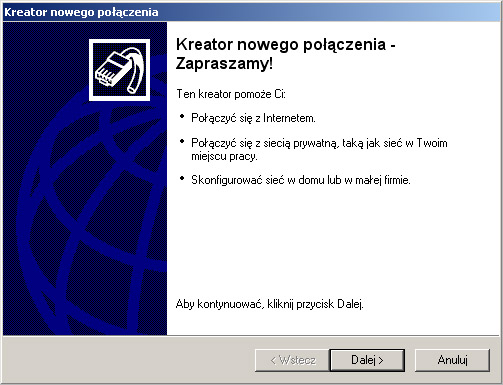 - Powinien pojawić się Kreator nowego połączenia. Klikamy Dalej.
