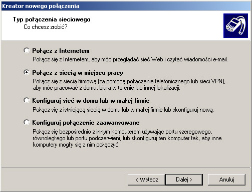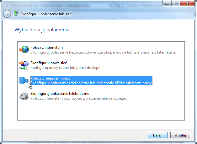 - Wybieramy opcję Połącz z siecią w miejscu pracy i klikamy Dalej.