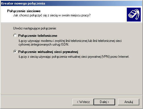- Wybieramy opcję Połączenie wirtualnej sieci prywatnej i klikamy Dalej.