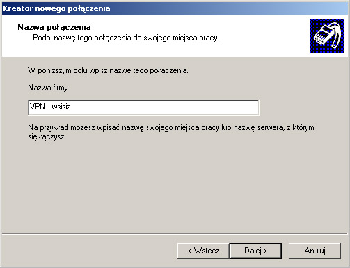- Wpisujemy nazwę dla naszego połączenia VPN (np. VPN-wsisiz) i klikamy Dalej.