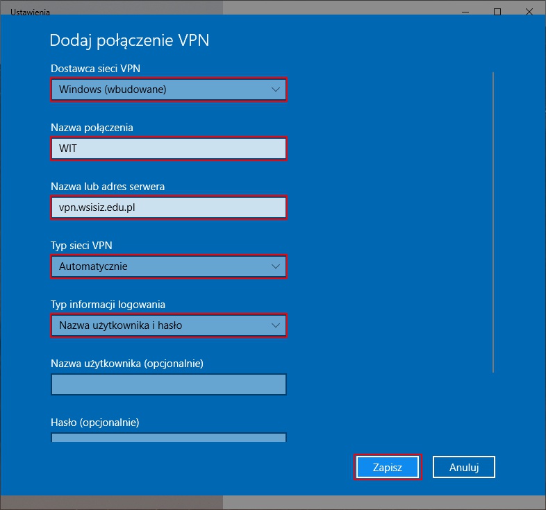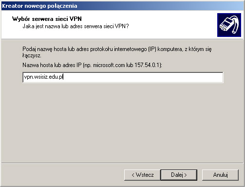 vpn.wsisiz.edu.pljako adres oraz dowolną nazwę (np.VPN WIT). Klikamy “Dalej”