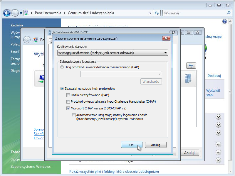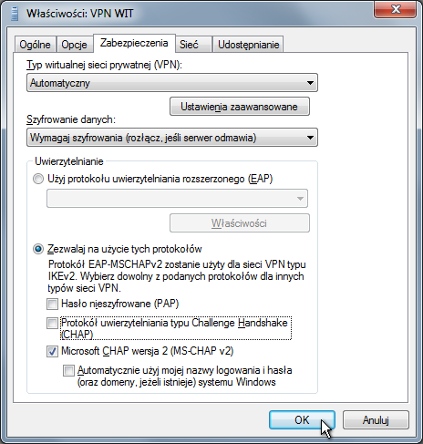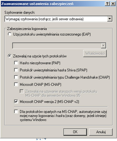 - Z listy Szyfrowanie danych wybieramy Wymagaj szyfrowania (rozłącz jeśli odmawia), następnie zaznaczamy opcję poniżej Zezwalaj na użycie tych protokołów i wybieramy tylko opcję Microsoft CHAP wersja 2 (MS-CHAPv2). Następnie klikamy OK.