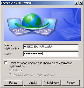 - Wpisujemy swój login poprzedzony domeną WSISIZ.EDU.PL oraz hasło systemowe i klikamy Połącz.
