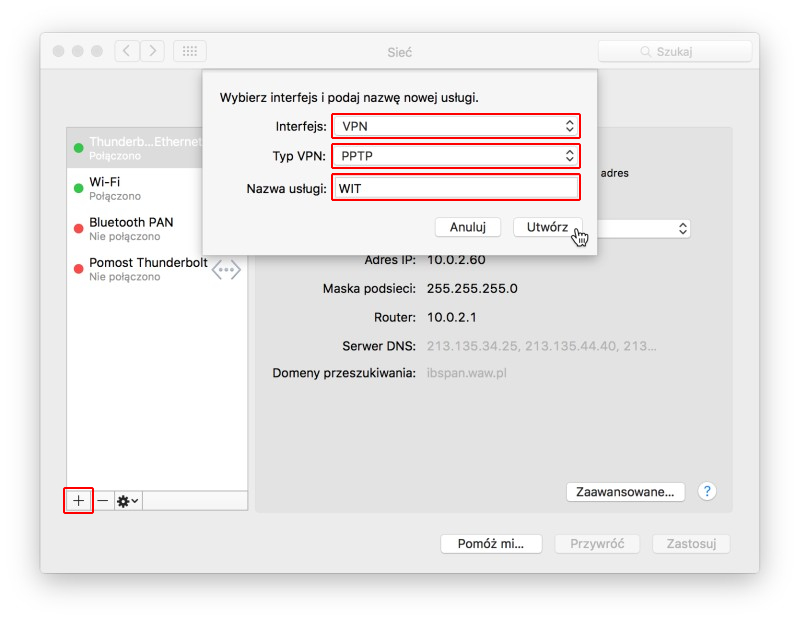 Następnie w polu Interfejs wybierz VPN, w polu Typ VPN wybierz PPTP i wpisz nazwę usługi np. WIT.