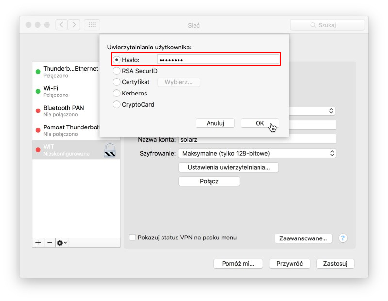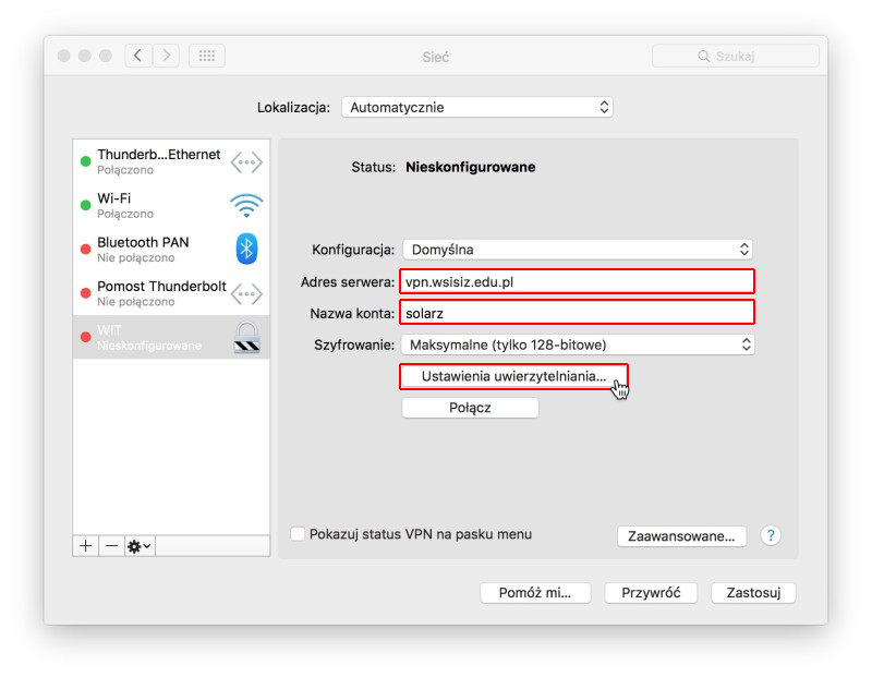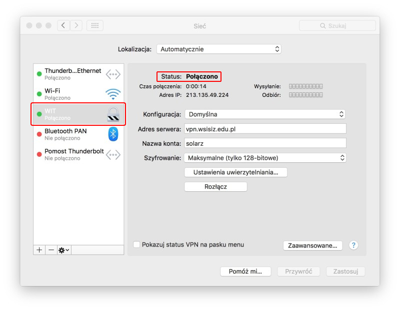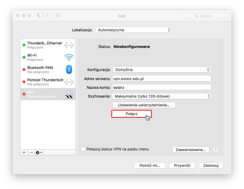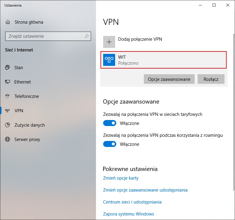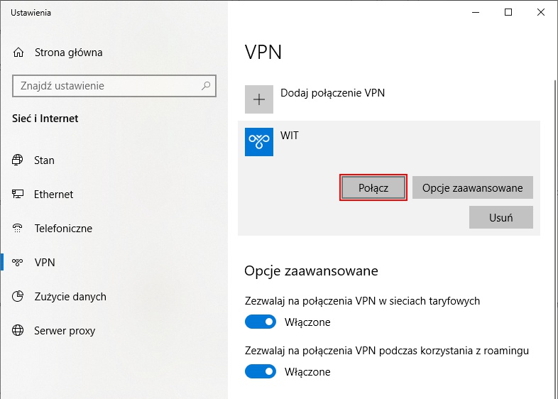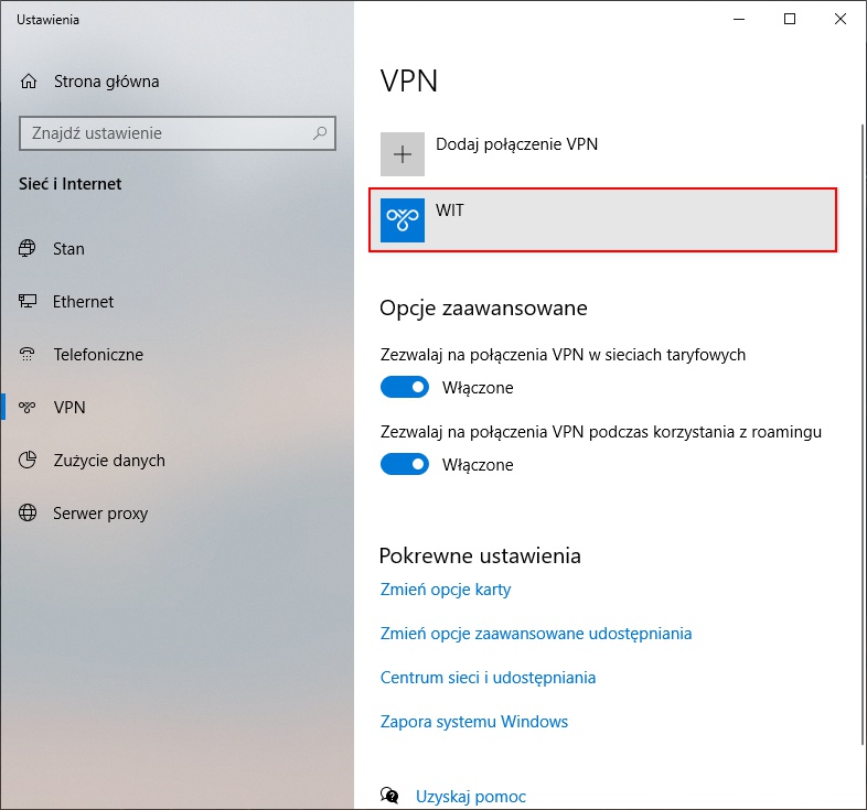 - Klikamy nowo utworzone połączenie VPN (WIT)