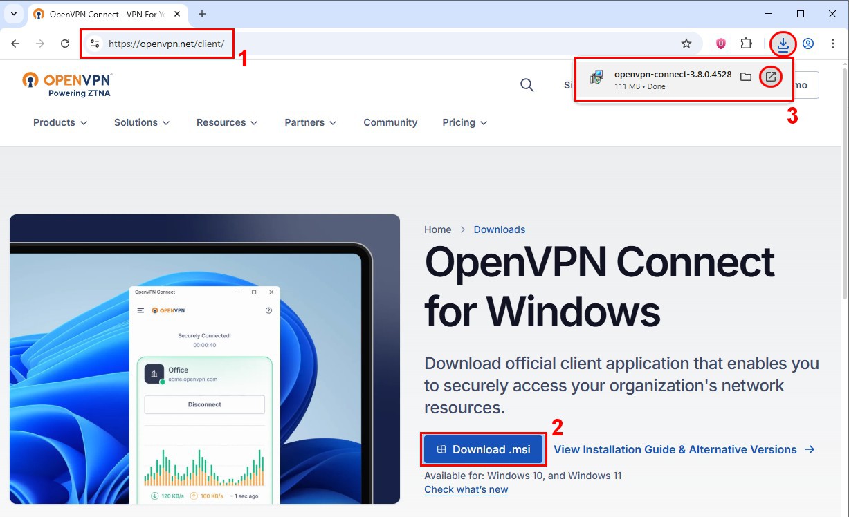 - Wejdź na oficjalną stroną OpenVPN (https://openvpn.net/client/), następnie pobierz i uruchom instalator.