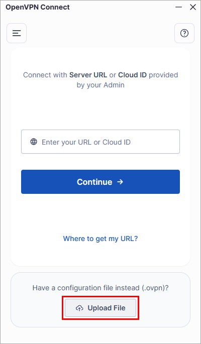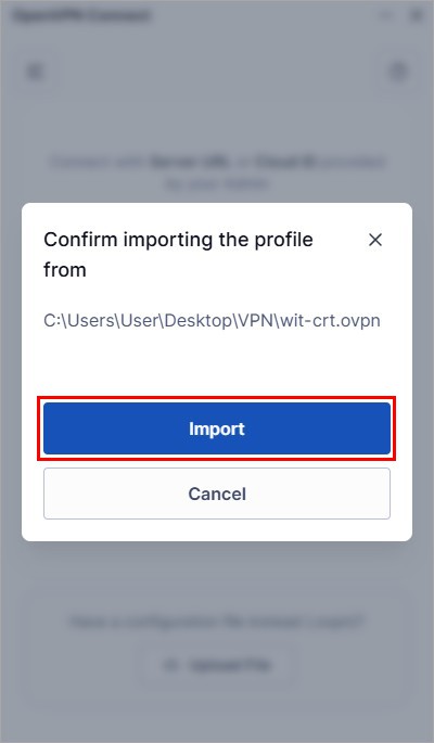 - Kliknij Upload File aby zaimportować plik profilu (WIT-VPN.ovpn)