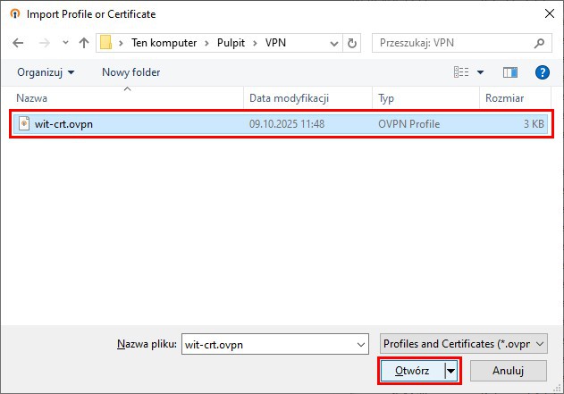 - Wybierz wcześniej pobrany plik profilu (WIT-VPN.ovpn), a następnie kliknij Otwórz