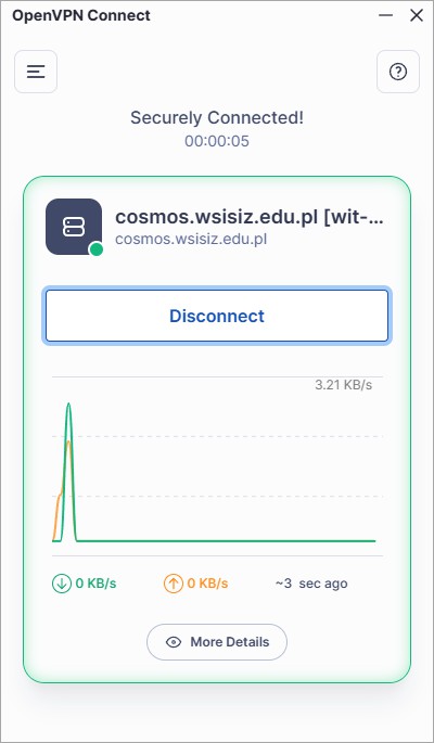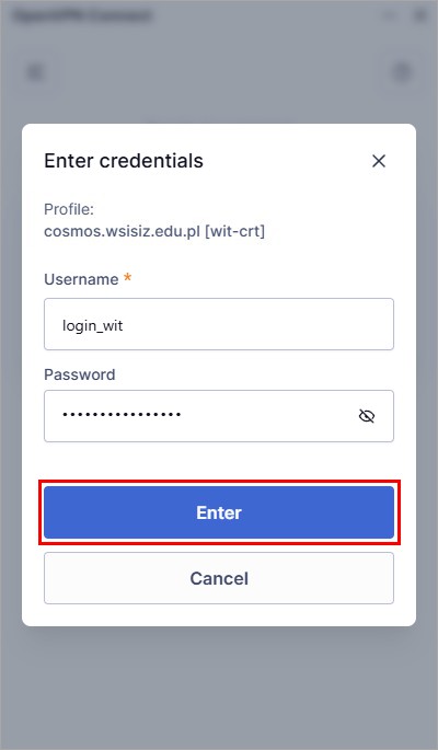 - Wpisujemy hasło systemowe i klikamy Połącz – powinniśmy uzyskać dostęp do bramy VPN.