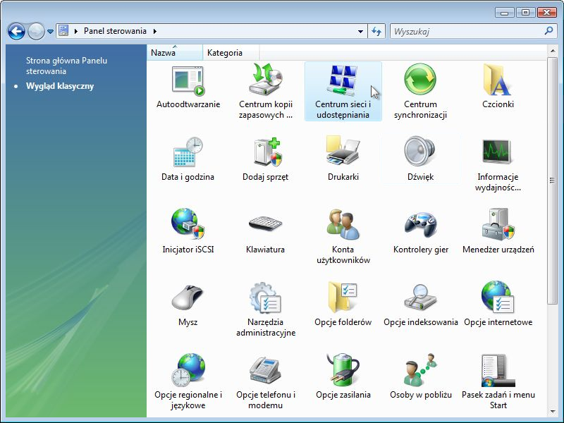 - W oknie Panelu sterowania klikamy ikonkę Centrum sieci i udostępniania