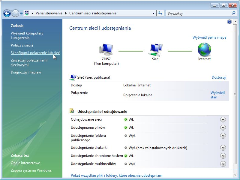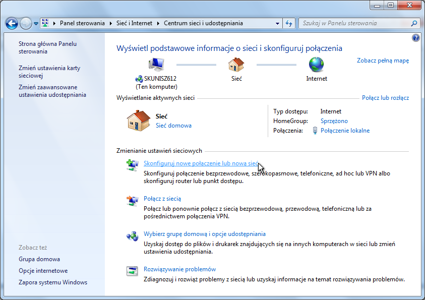 - W oknie Centrum sieci i udostępniania wybieramy odnośnik Skonfiguruj nowe połączenie lub nową sieć.