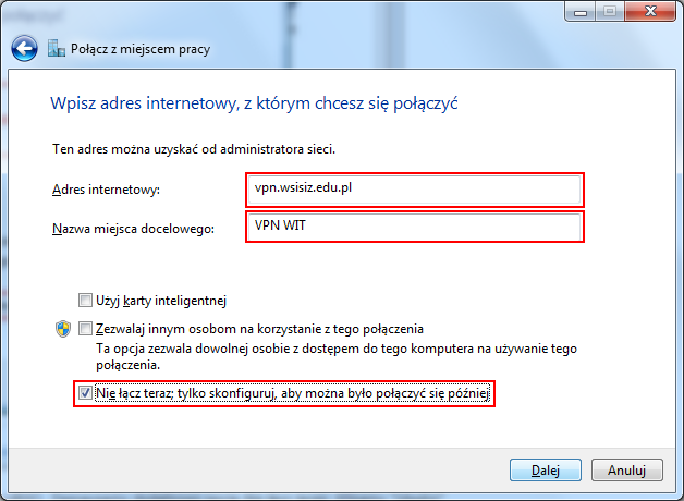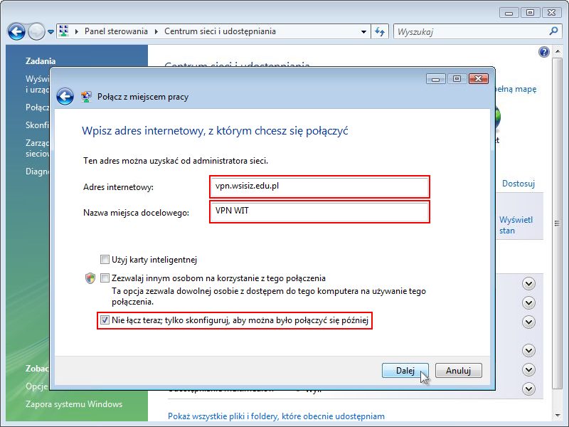 vpn.wsisiz.edu.pljako adres oraz dowolną nazwę (np.VPN WIT). Dodatkowo zaznaczamy opcję Nie łącz teraz. Klikamy “Dalej”