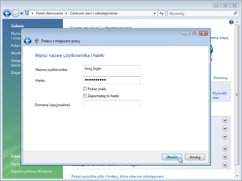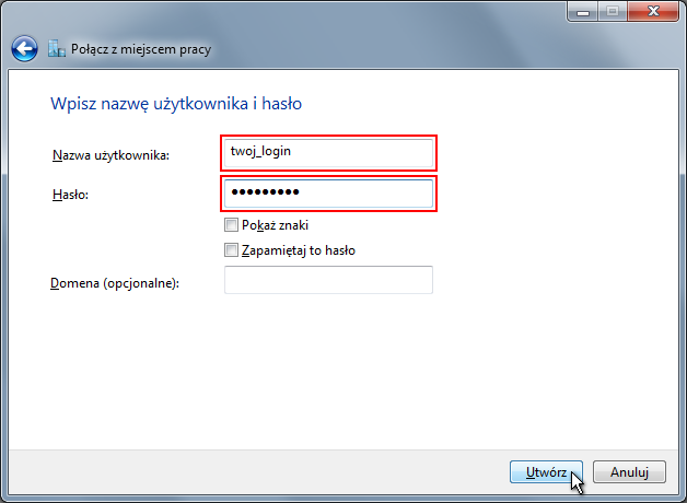 - Podajemy swój login oraz hasło systemowe. Zaznaczamy dodatkowo opcję Nie łącz teraz. Klikamy “Utwórz”