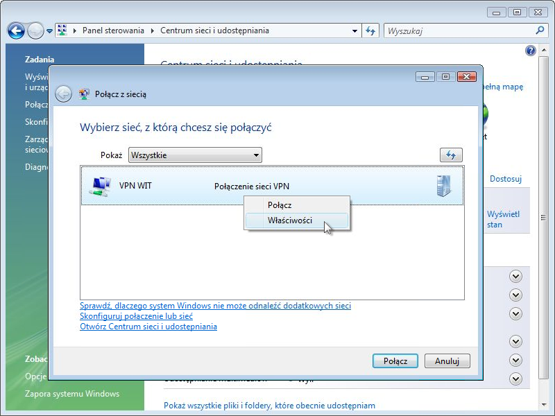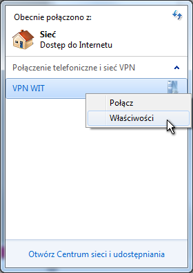 VPN WITpowinien pojawić się na liście połączeń, klikamy na niego prawym przyciskiem myszy i wybieramy menu Właściwości