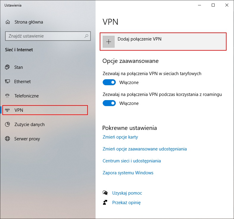 - Wybieramy zakładkę VPN, a następnie klikamy Dodaj połączenie VPN