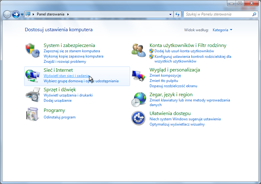 - W oknie Panelu sterowania z pozycji Sieć i Internet klikamy ikonkę Wyświetl stan sieci i zadania.