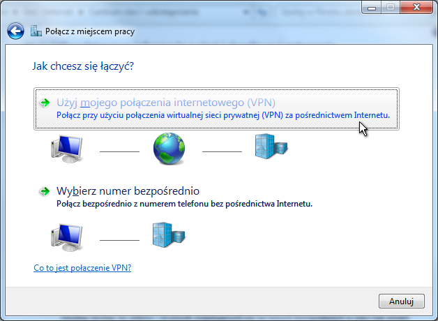 - Wybieramy łączenie za pośrednictwem połączenia Internetowego (VPN).