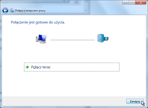 - Po zmianie ustawień klikamy Połącz, jeśli nie zapamiętaliśmy hasła należy je jeszcze raz wprowadzić. Po kliknięciu przycisku Połącz powinniśmy uzyskać dostęp do bramy VPN